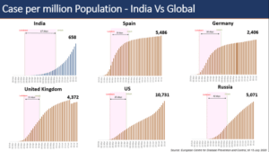 India ranks 106th with 658 cases per million. Cases per million population in India are four to eight times less than European countries. COVID-19 cases per million in Russia & US are eight and 16 times, respectively, of the corresponding figure in India.