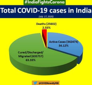 New Delhi: India registered a record single-day spike of 34,956 COVID-19 cases taking the country’s tally past the 1-million mark to 10,03,832 on Friday.