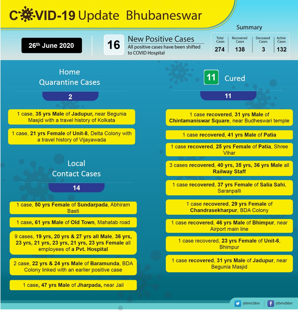 With three deaths and 138 recoveries, Bhubaneswar now has 132 active cases.