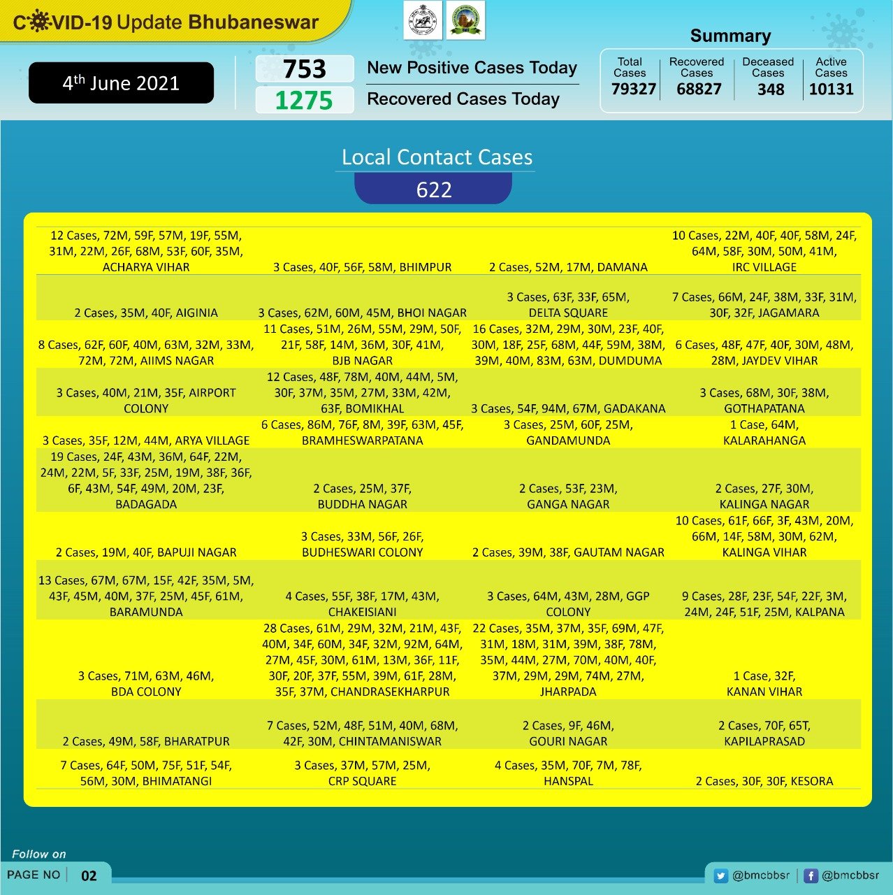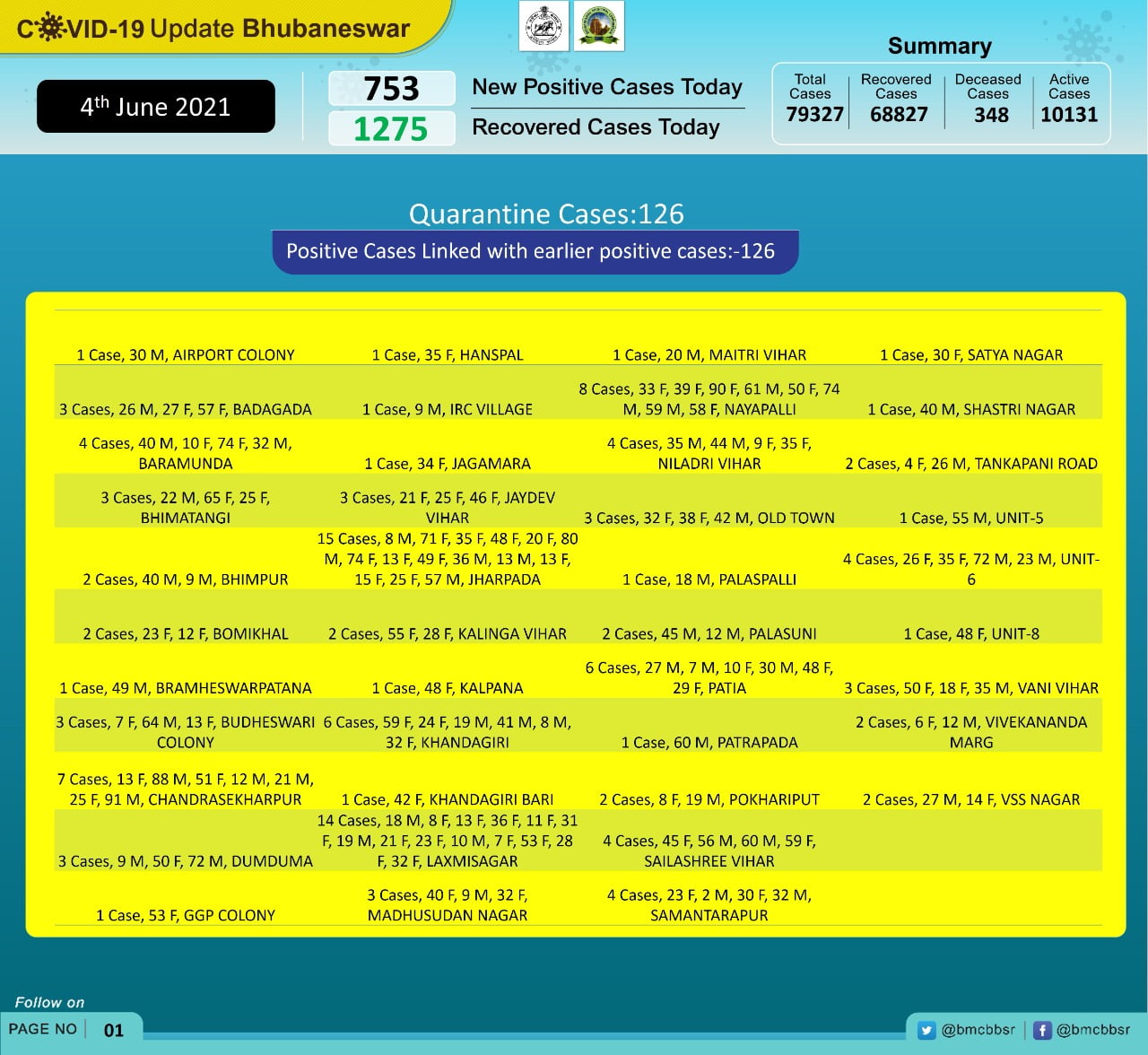 Maximum cases were reported from Patia (47), followed by Nayapalli (42), Chandrasekharpur (28), Sailashree Vihar (27), Old Town (23), Jharpada (22), Laxmisagar (20), Badagada (19), Khandagiri (18), Dumduma and Mancheswar (16 each).