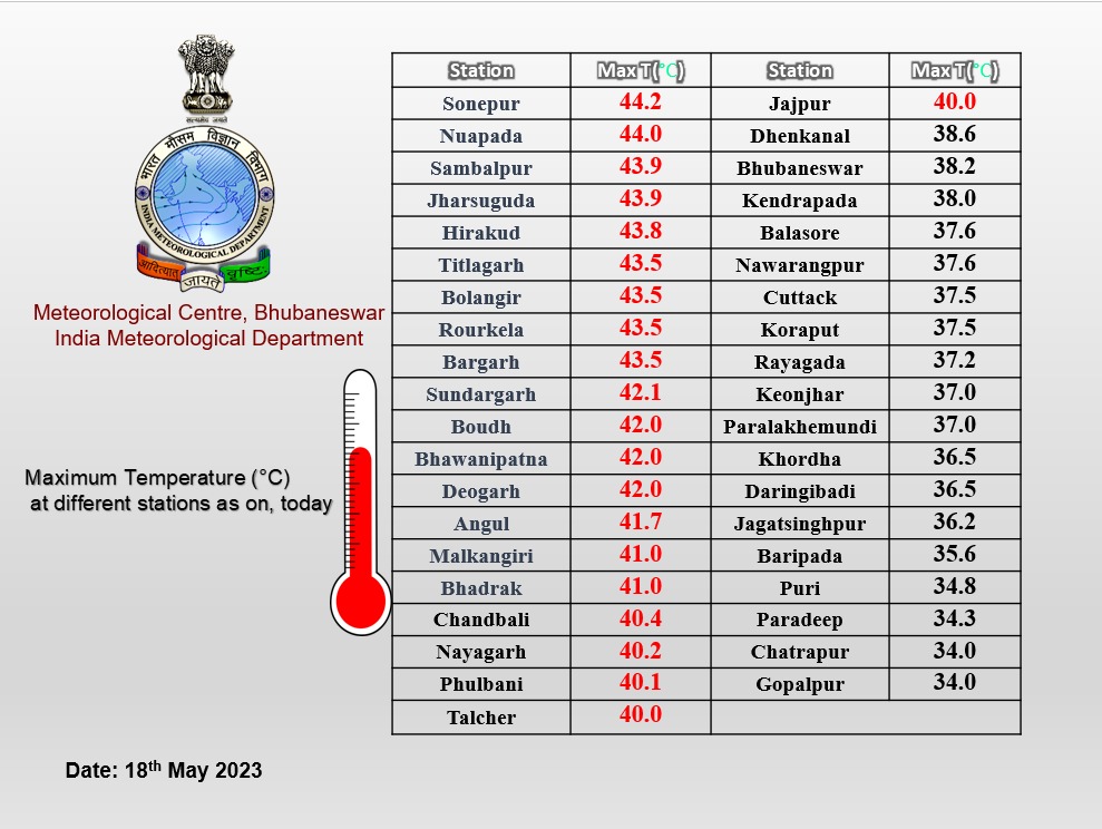 The IMD has forecast that there will be no large change in maximum temperature (day temperature) at many places in the state during next 5 days. It is likely to be 42 degree Celsius or more at a few places of interior Odisha including Sundargarh, Sambalpur, Angul, Boudh, Sonepur, Bargarh, Balangir and Kalahandi.