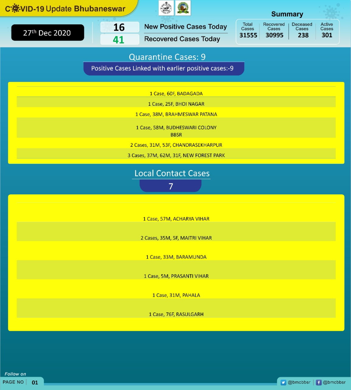 On Sunday, a total of 16 new cases have been reported in the last 24 hours, the tally in Bhubaneswar went up to 31,555 on Sunday.