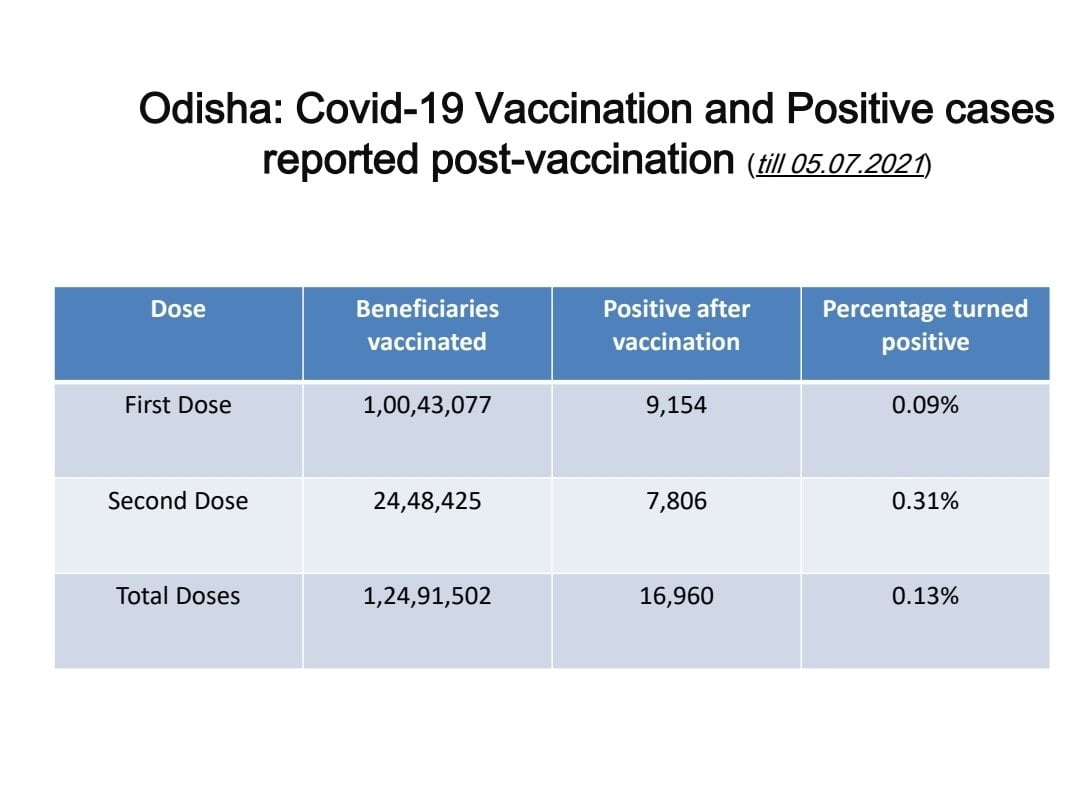 Bhubaneswar: A total of 16,960 (0.13%) people either fully vaccinated or with the first dose have tested positive for COVID-19 in Odisha.