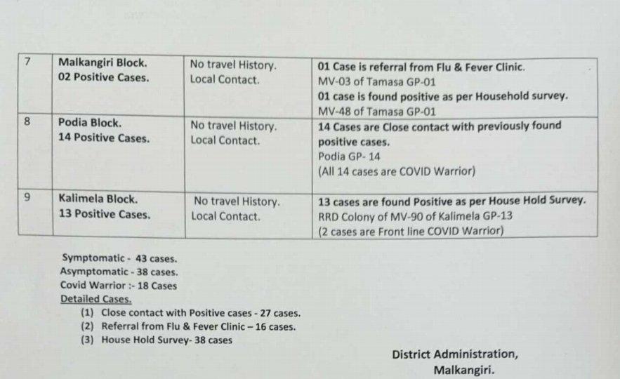 The highest of 19 cases have been reported from Malkangiri municipality followed by 15 from Korukonda, 14 from Podia block, 13 from Kalimela, nine from Chitrakonda, seven from Khoriput, two from Malkangiri block and one each from Mathili and Balimela NAC.