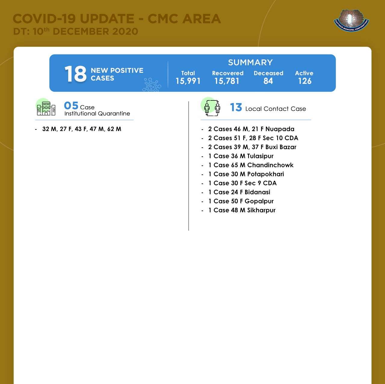 According to Cuttack Municipal Corporation (CMC), of the new cases, five were from quarantine centres and 13 local contact cases. A