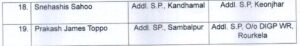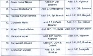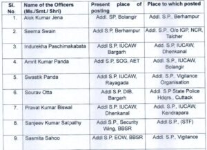 Similarly, Sourav Otta has been transferred to State Police Headquarters in Cuttack. Indurekha Paschimakabata has been posted as Additional. SP, IUCAW, Dhenkanal, and Amrit Kumar Panda as additional SP, IUCAW, Balangir. Swastik Panda will now serve with the Vigilance Organisation.
