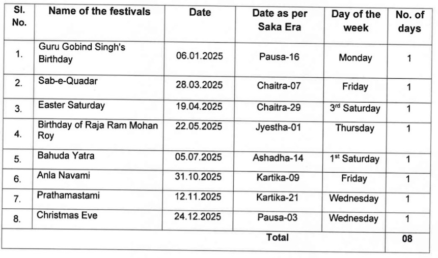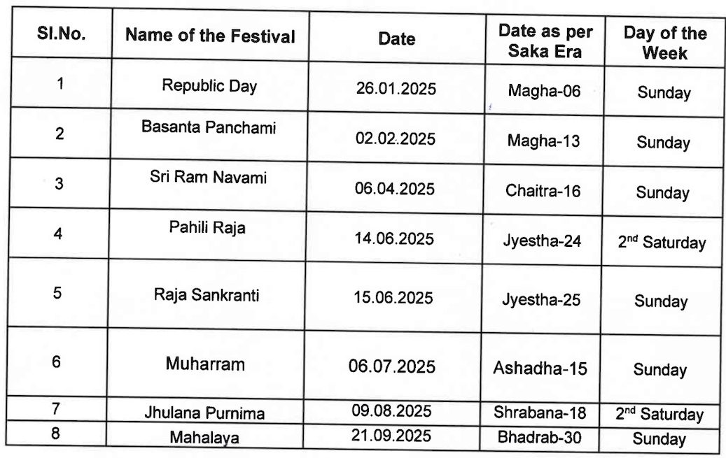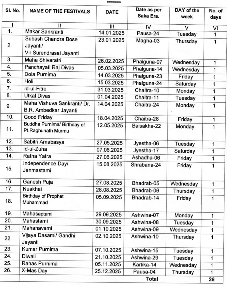 Bhubaneswar: The Odisha government on Tuesday released the list of holidays for its employees in 2025.