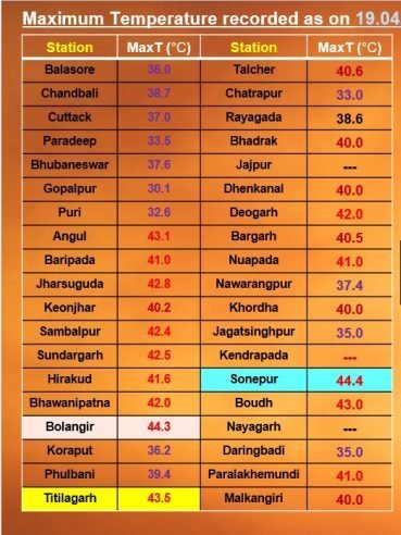 Sonepur was the hottest place in the state at 44.4 degree Celsius, followed by Balangir at 44.3; Titlagarh 43.5; Angul 43.1; Boudh: 43; Jharsuguda 42.8; Sambalpur 42.4; Sundargarh 42.5; Bhawanipatna and Deogarh 42.