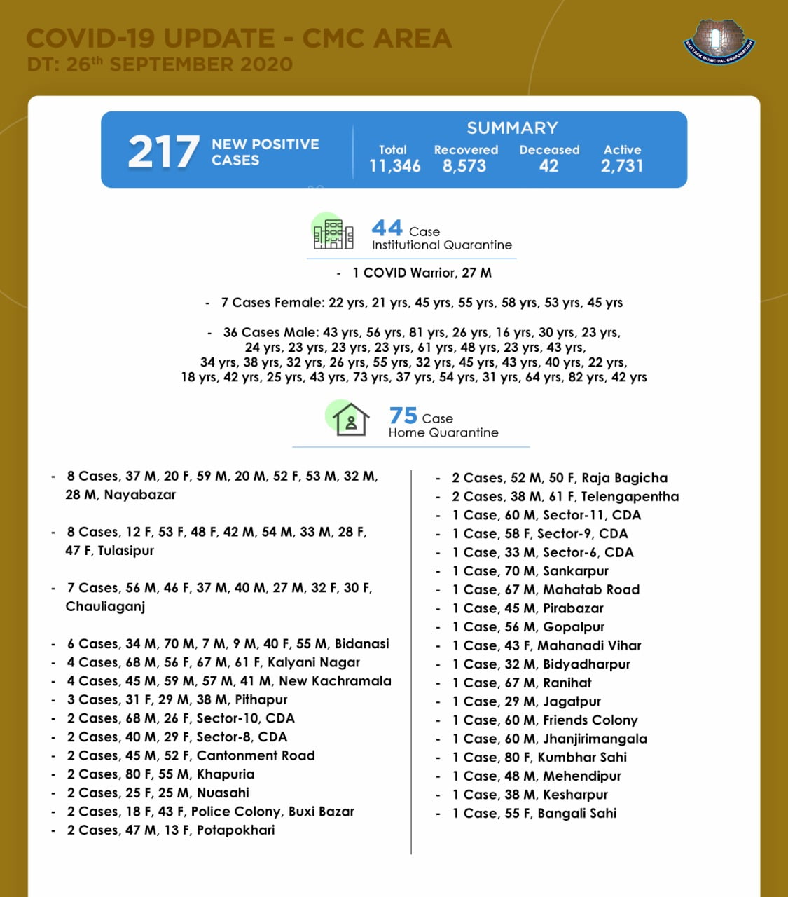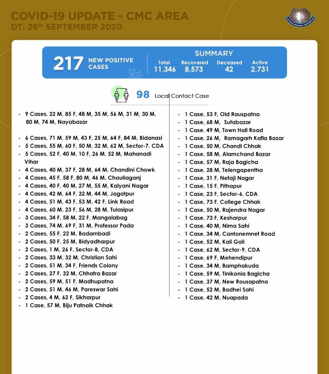 With 42 deaths and 8573 recoveries, Cuttack city now has 2731 active cases.
