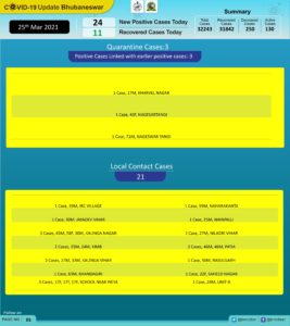 Of the new cases of the day, 21 were local contacts and the rest from quarzntine centres, according to Bhubaneswar Municipal Corporation (BMC).