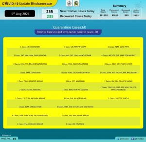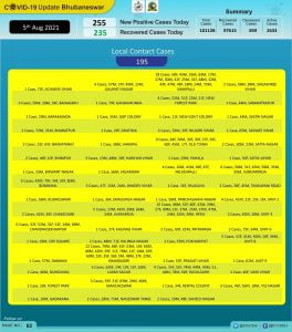 The new cases registered during the period included 60 were from quarantine and 195 local contacts, Bhubaneswar Municipal Corporation (BMC) stated in a tweet.