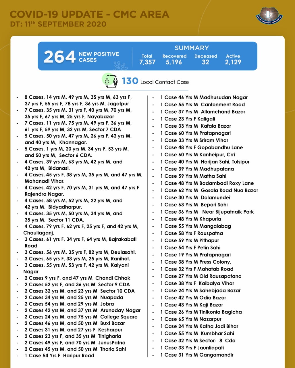 Cuttack: As many as 264 COVID-19 positive cases were reported from different parts of the city here on Friday.