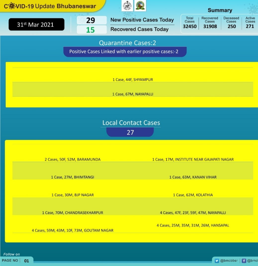 According to the Bhubaneswar Municipal Corporation (BMC), of the new cases, two are from quarantine and 27 are local contacts.