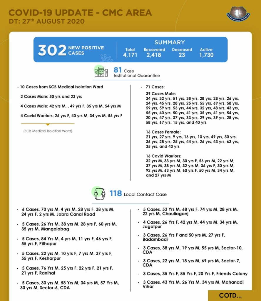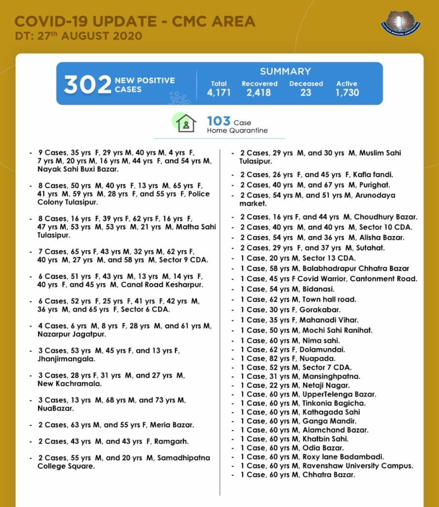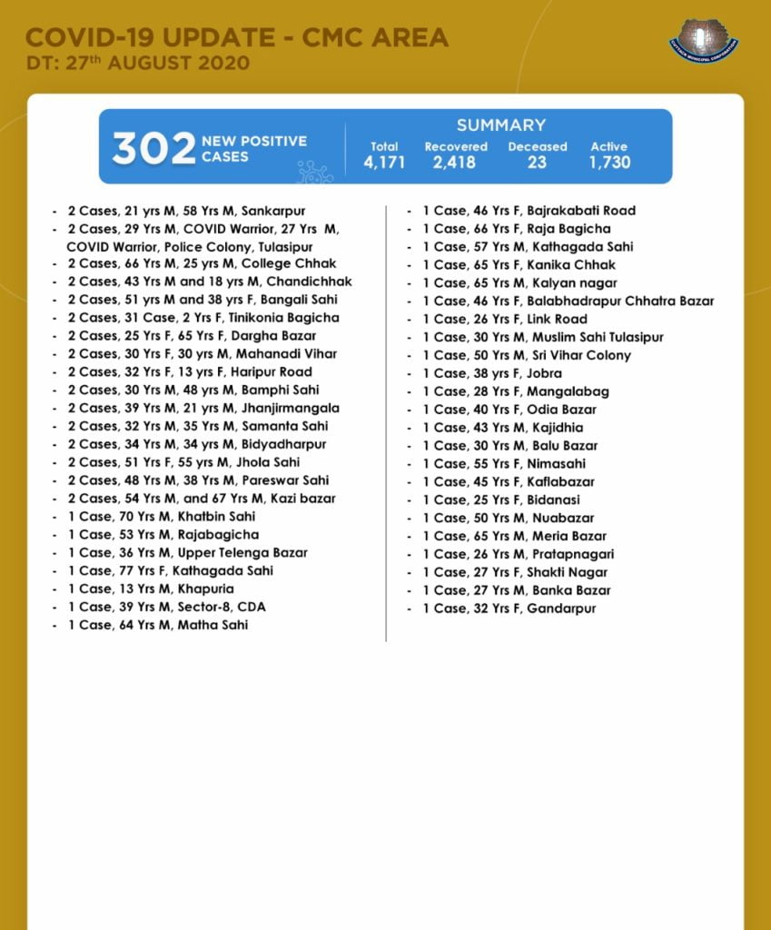 Cuttack: With 302 new COVID-19 cases reported in the city on Thursday, the positive tally went up to 4171.
