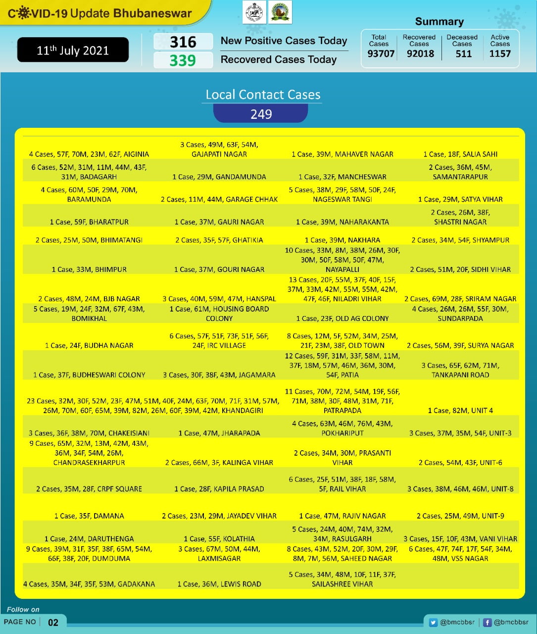 Bhubaneswar had reported 314 new cases on Saturday. Of the new cases detected on Sunday, 67 were from quarantine and 249 were local contacts, Bhubaneswar Municipal Corporation (BMC) stated in its tweet.