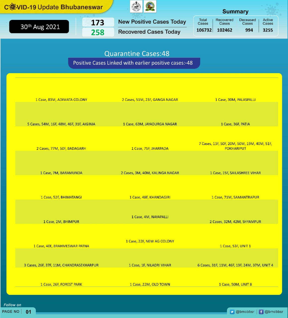 According to Bhubaneswar Municipal Corporation (BMC), 48 of the new infections are from quarantine and 125 local contacts
