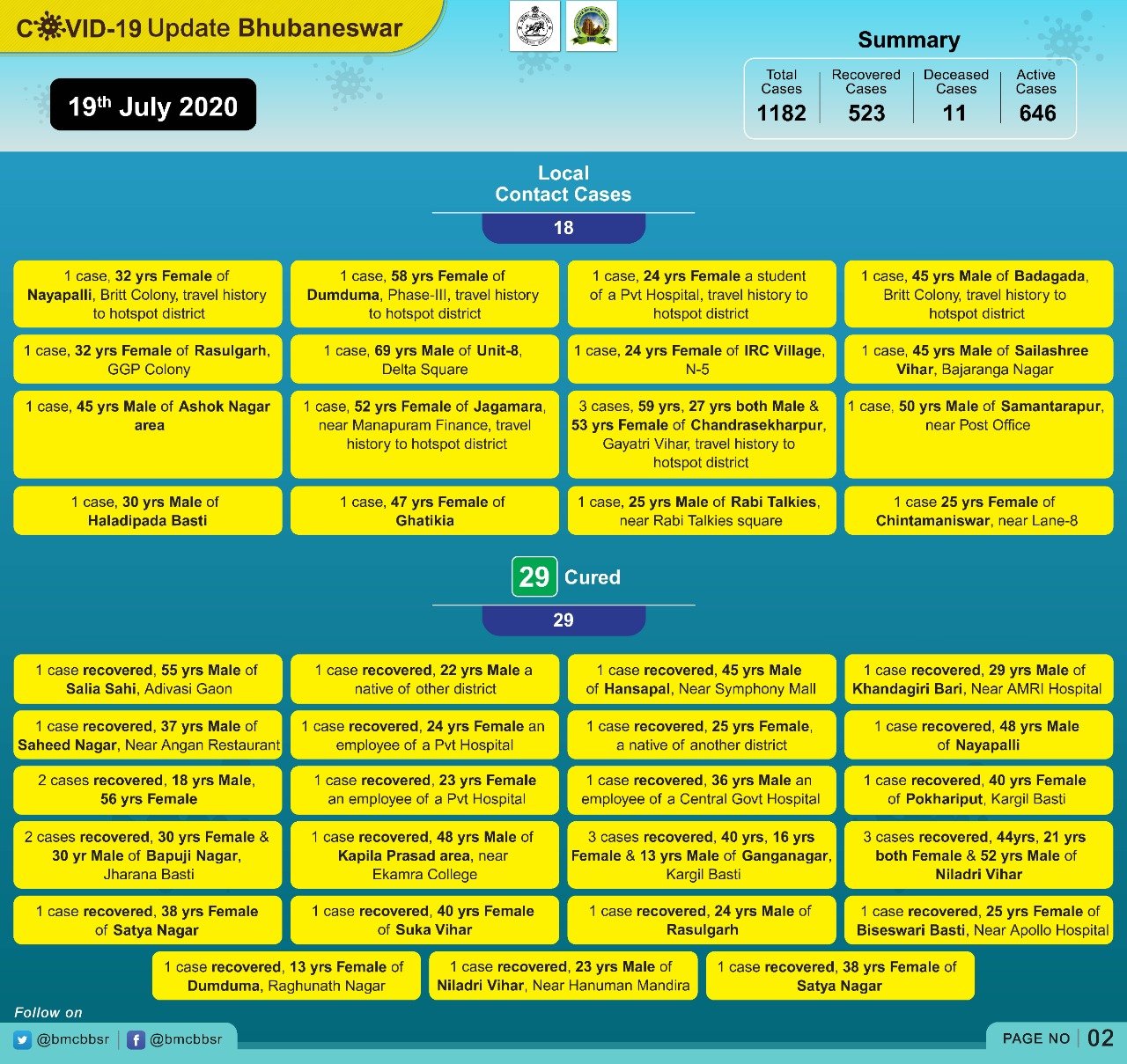 With 11 deaths and 523 recoveries, Bhubaneswar now has 646 active cases.