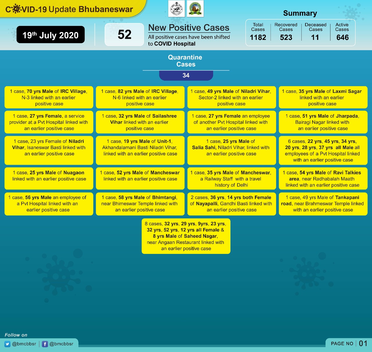 With 11 deaths and 523 recoveries, Bhubaneswar now has 646 active cases.