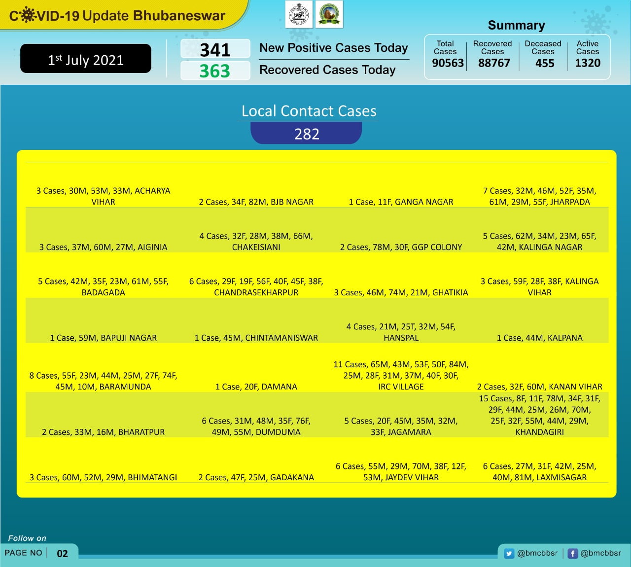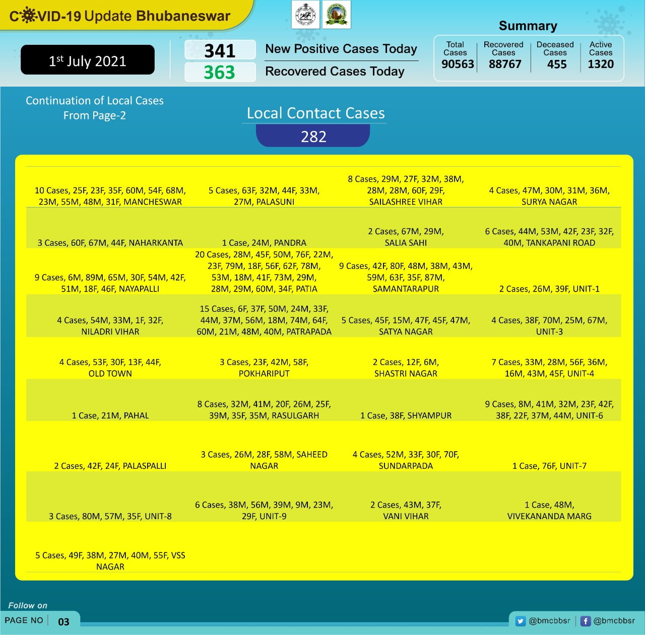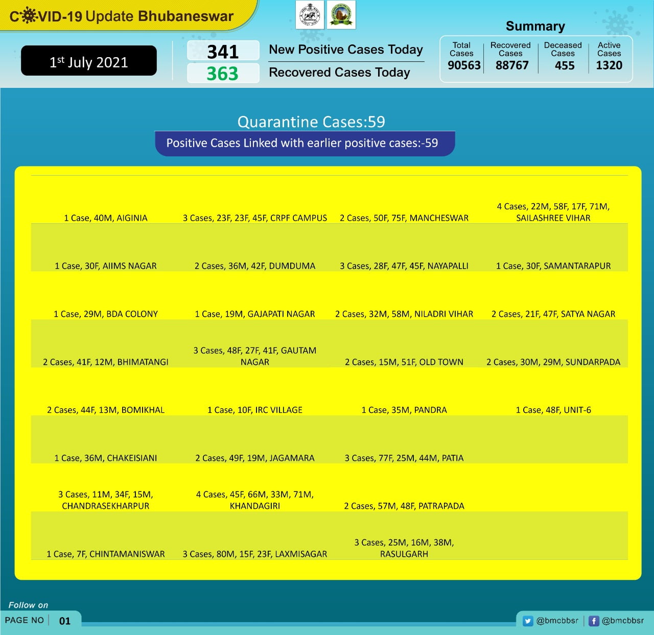 Of the new cases, 59 are from quarantine and 282 are local contacts, Bhubaneswar Municipal Corporation stated in its tweet.