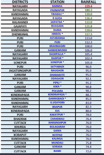 Barmul was closely followed by Padmapur in Rayagada district which recorded 180.3 mm of rainfall, while Tikabali in Kandhamal district received 139 mm, it said adding Guda in Rayagada recorded 136.4 mm rainfall and Jaipatna in Kalahandi recorded 122 mm.
