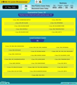 Bhubaneswar: COVID-19 positive cases went up to 30,418 in Bhubaneswar after 46 new cases were reported in the last 24 hours.
