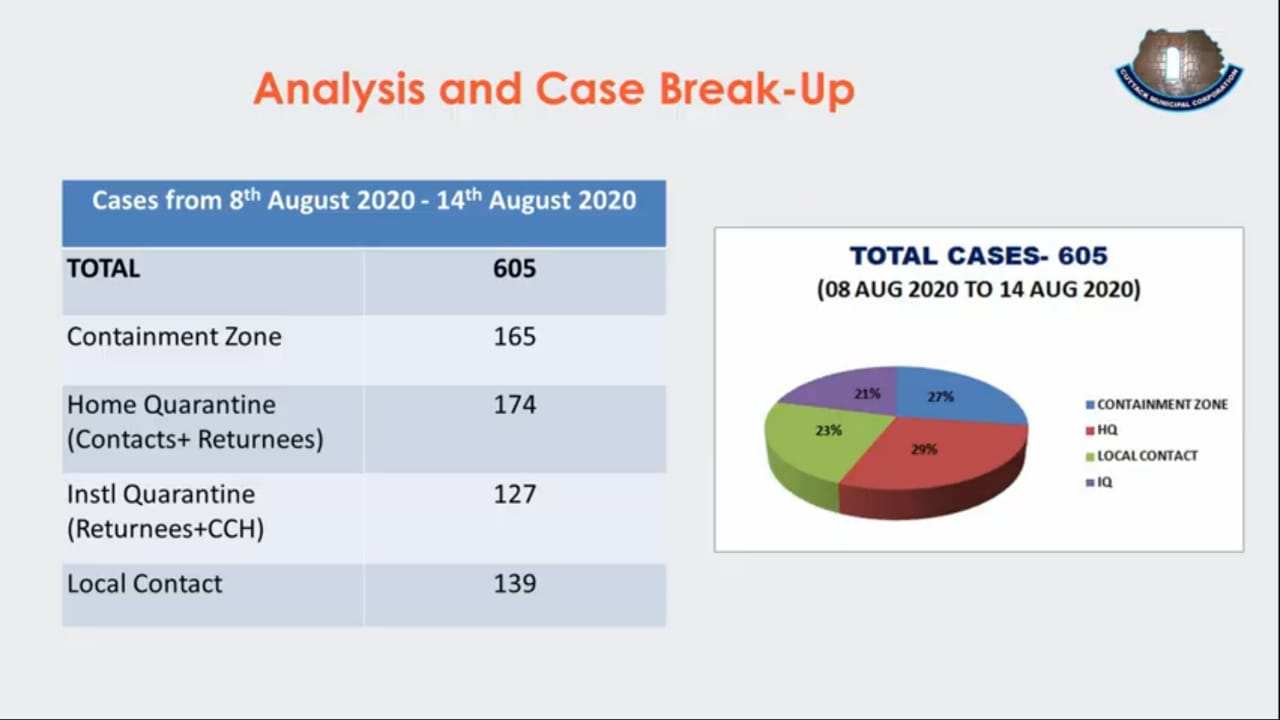 The commissioner informed that 174 of the 605 cases in the last one week have been reported among those in home quarantine (contacts and returnees), followed by 165 from containment zone while 139 are local contact and 127 institutional quarantine (returnees and CCH) cases.