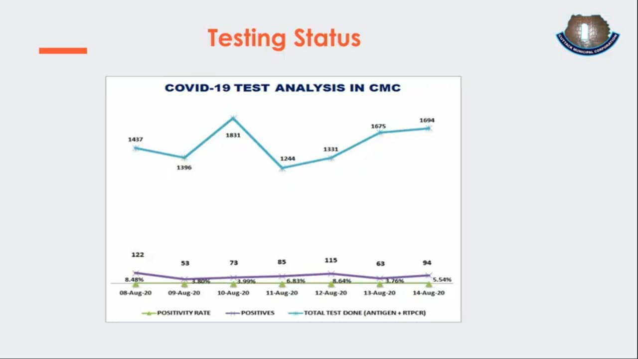 Das said that the number of tests has been increased and the positivity rate varies between 3 per cent to 8 per cent. “The positivity rate was around 8 per cent on August 8 and August 12 because cluster-wise tests were being conducted on these days. In some clusters, 20 to 30 cases were detected and this led to a rise in the positivity rate,” she said.
