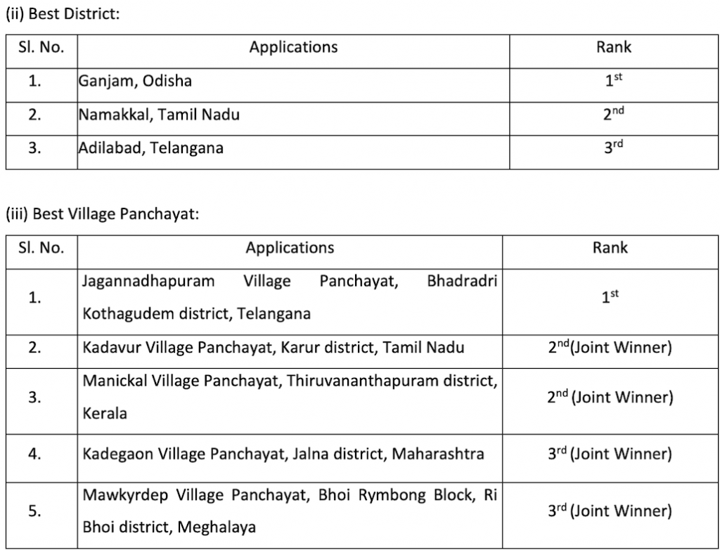 Similarly, the award for the Best District will be conferred on Odisha’s Ganjam, while 2nd prize will go to Namakkal in Tamil Nadu and 3rd prize to Adilabad, Telangana.