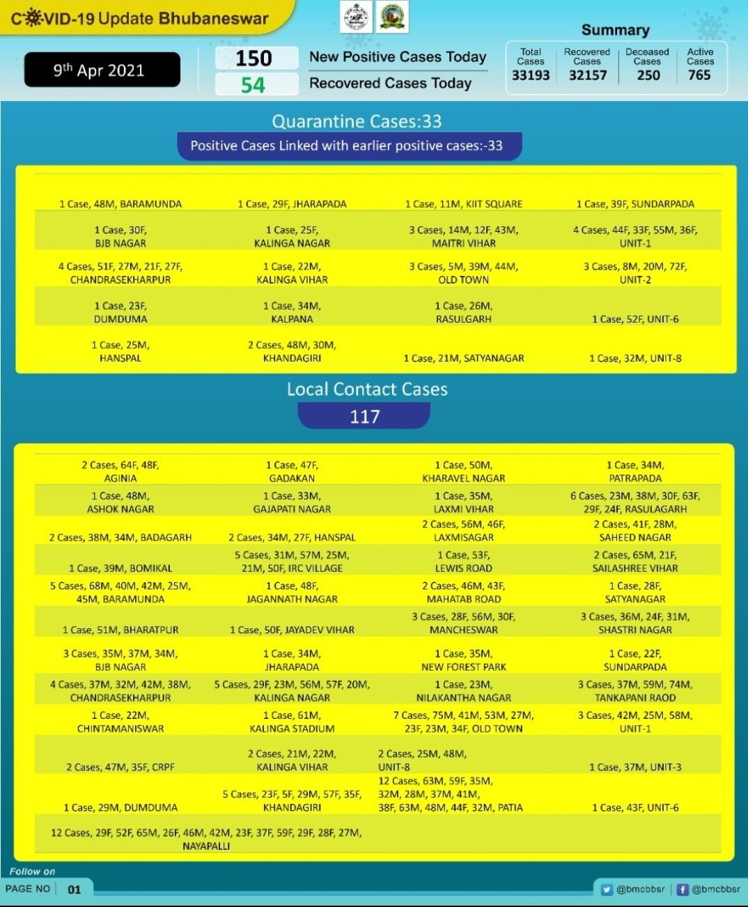 According to Bhubaneswar Municipal Corporation (BMC), of the new cases, 117 were from local contacts and 33 were quarantine cases.