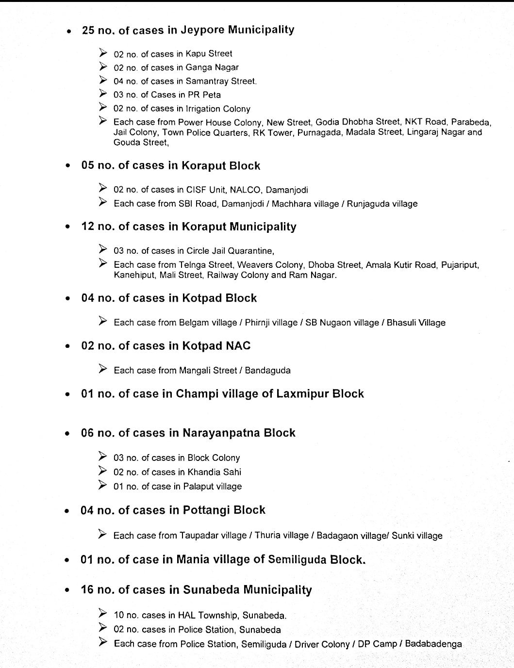 The highest 25 cases were reported from Jeypore municipality, followed by 16 from Sunabeda municipality, 12 from Koraput municipality, nine from Bandhugaon, six from Narayanpatna, five from Koraput block, four each from Kotpad block and Pottangi, three from Boipariguda, two each from Botigumma, Kotpad NAC, and Kotpad NAC and one each from Semiliguda, Laxmipur, and Dasmantpur.