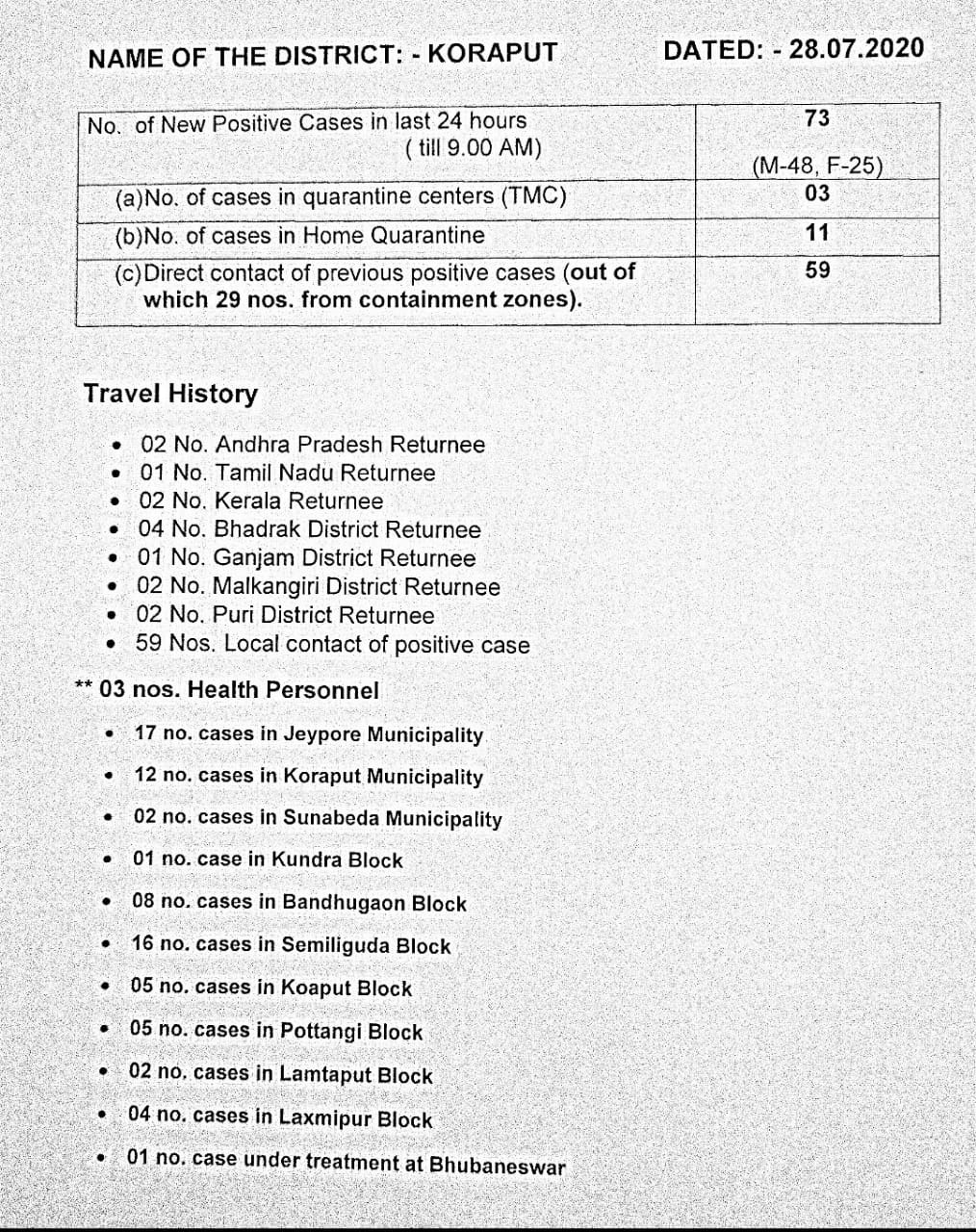 Jeypore: The COVID-19 tally in Koraput district rose to 558 on Tuesday with an overnight addition of 73 fresh cases.