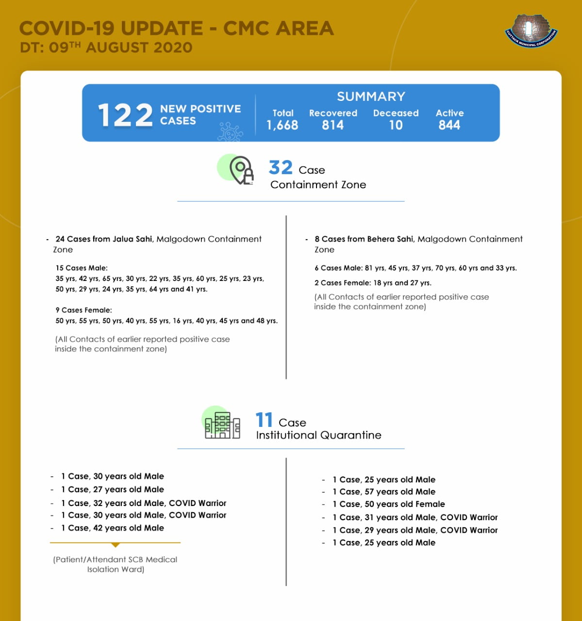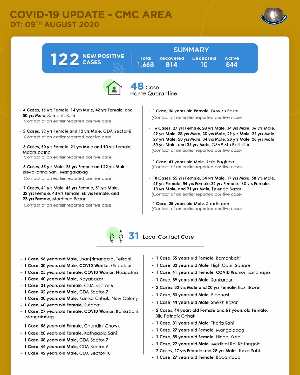 With 10 deaths and 814 recoveries, Cuttack city now has 844 active cases.
