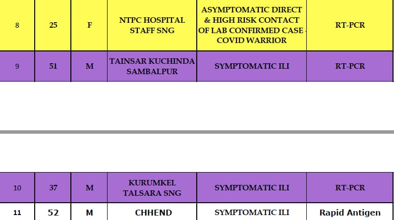 The district administration also shared the details of 11 of 33 positive cases of July 27, which were sent for re-confirmation. Among them, six are from Dengibhadi. They are symptomatic and contacts of an earlier confirmed case. Two NTPC hospital staff have also been infected by a high-risk contact.