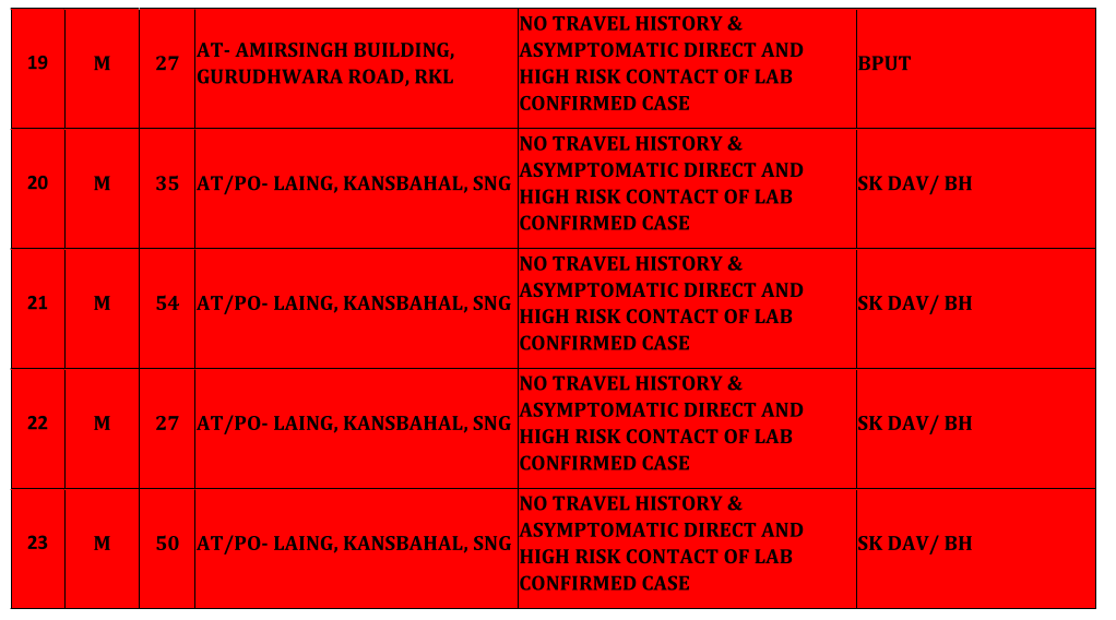 The administration tweeted that two among are at BBSR COVID Hospital, 12 are COVID warriors, one local contact at Kuarmunda, 34 are contacts of previous positive cases and 13 are returnees from outside the district.