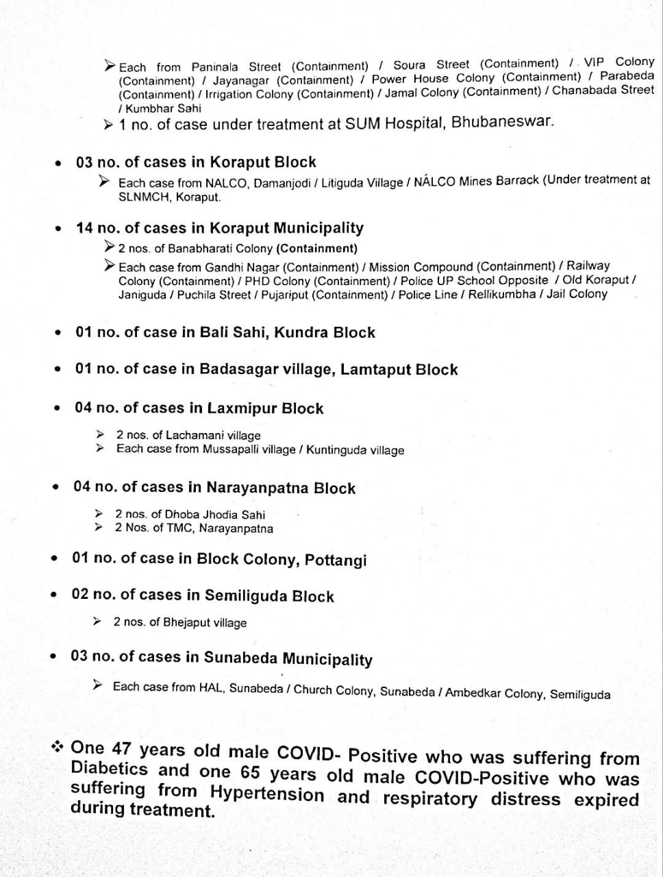 According to the district administration, 19 cases have been reported from Jeypore municipality, 14 from Koraput municipality while four each from Narayanpatna and Laxmipur block, three each from Bandhugaon, Koraput block and Sunabeda municipality, two each from Boipariguda, Borigumma, and Semiliguda block and one each from Potangi, Lamtaput, Kundra block, and Jeypore block.