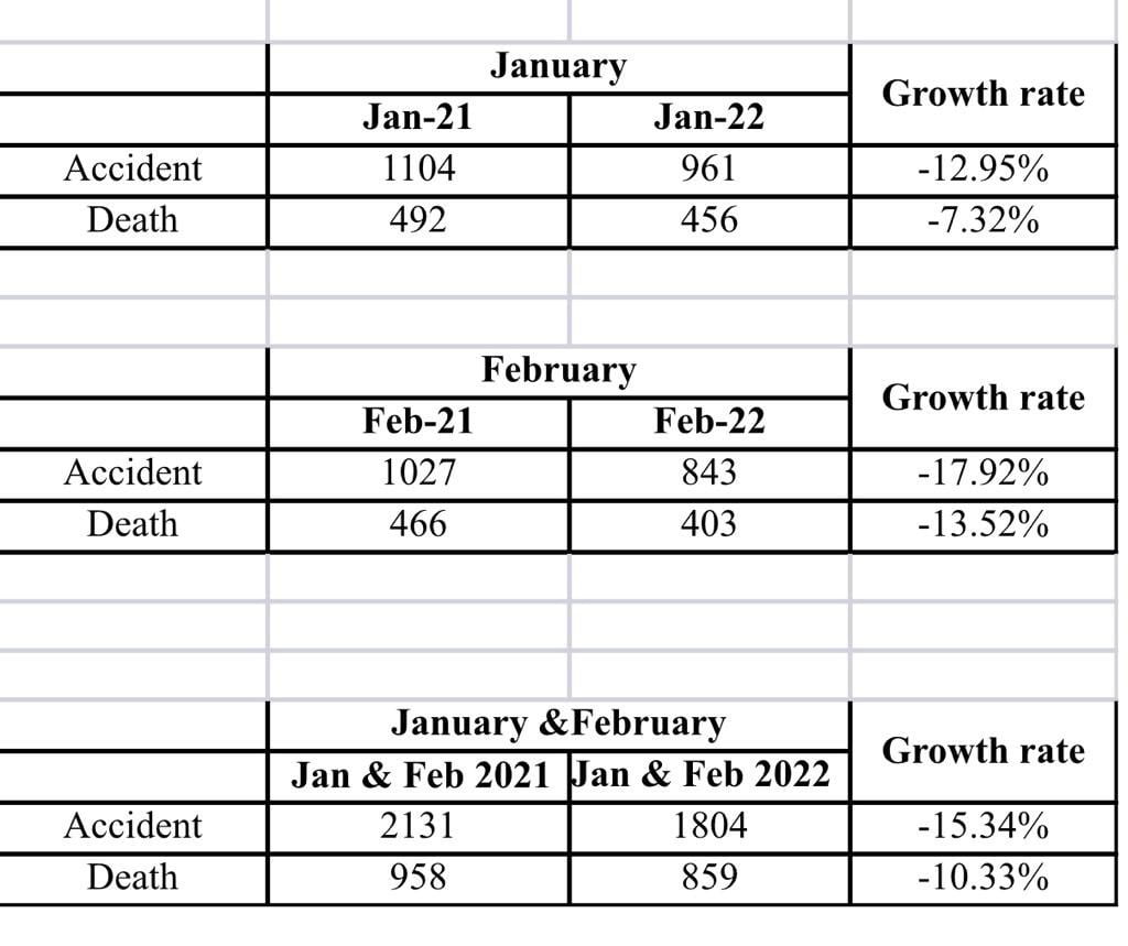 Accidents were less by 143 in January and fatalities dropped by 35 in the month.