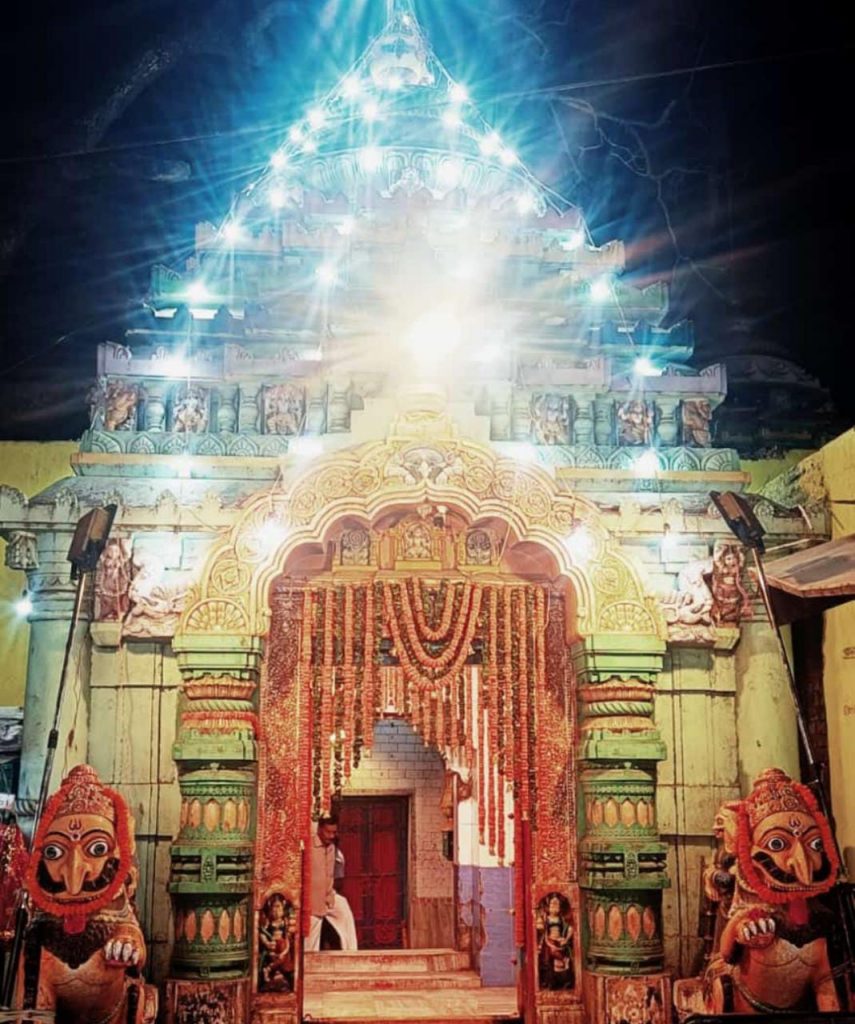 According to a legend, the chief of the Dera community used to collect flowers and offer it to the Goddess everyday. During a Chaitra Tuesday night he heard a girl crying on the road near his veranda. He opened the door with a lantern in his hand and came closer to the girl. He saw a young woman with black saree and open hair with tears in her eyes. He enquired as to why she was crying. The young lady replied that she was on the way to her father’s house but lost the track.