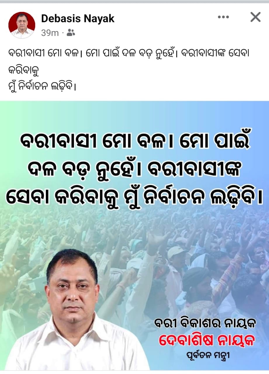 “People of Bari are my strength. Party is not paramount for me. I will contest the poll to serve them,” wrote the former Bari MLA, who had won the seat for four consecutive terms from 2000 to 2014 on BJD ticket.