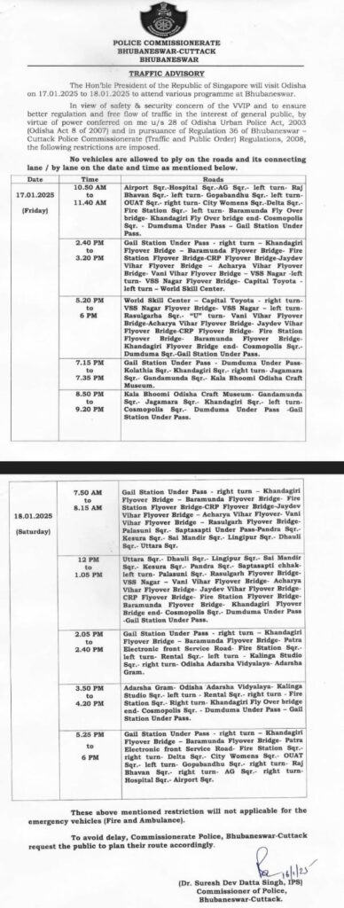 In view of Tharman’s visit, the Commissionerate Police has made elaborate security arrangements and issued a detailed traffic advisory to ensure smooth movement of the VVIP in Bhubaneswar.