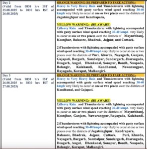 The IMD has issued an orange warning for Jagatsinghpur and Kendrapada districts on August 25, and Kandhamal, and Gajapati on August 26.