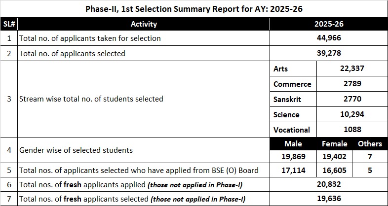 Bhubaneswar: Altogether 39,278 candidates have been selected for admission into Plus II courses across various streams in the second phase of the first selection process for the 2025-26 academic year in Odisha.