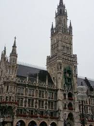 The Rathaus-Glockenspiel clock tower in Munich, Germany, was built in 1908. The 260-ft tower holding the mechanical clock is a tourist attraction today with its regular daily shows depicting 16th century stories through life-size figures.