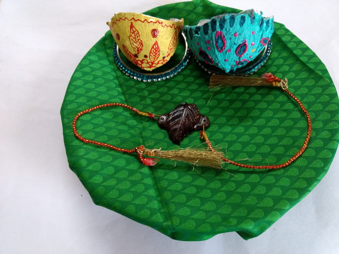 “It takes two days to make one Rakhi with coconut shell. I have to clean, dry and polish the shell and then apply colours,” said Nibedita. Besides Rakhis, she is also making small bowl sets.