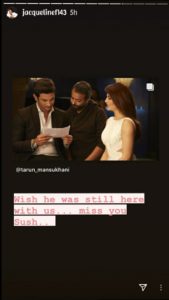 Jacqueline took to Instagram to repost film director Tarun Mansukhani’s post, and wrote, “Wish he was still here with us… miss you Sush.”