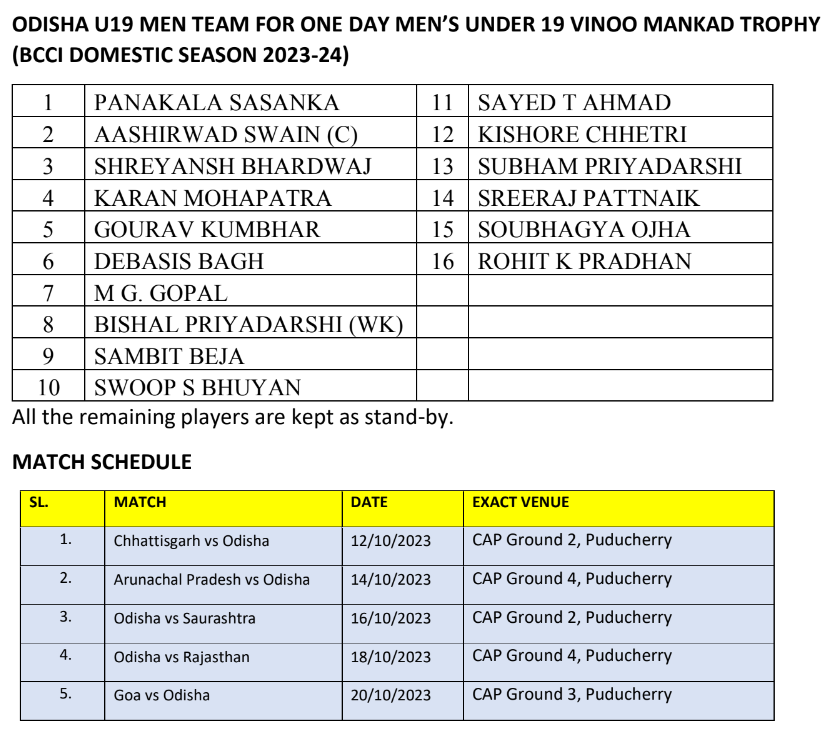 Odisha Cricket Association (OCA) Secretary Sanjay Behera said that Aashirwad Swain has been named as the captain of the team. He was a part of the Odisha Senior Men’s Camp for Syed Mushtaq Ali Trophy 2023-24.