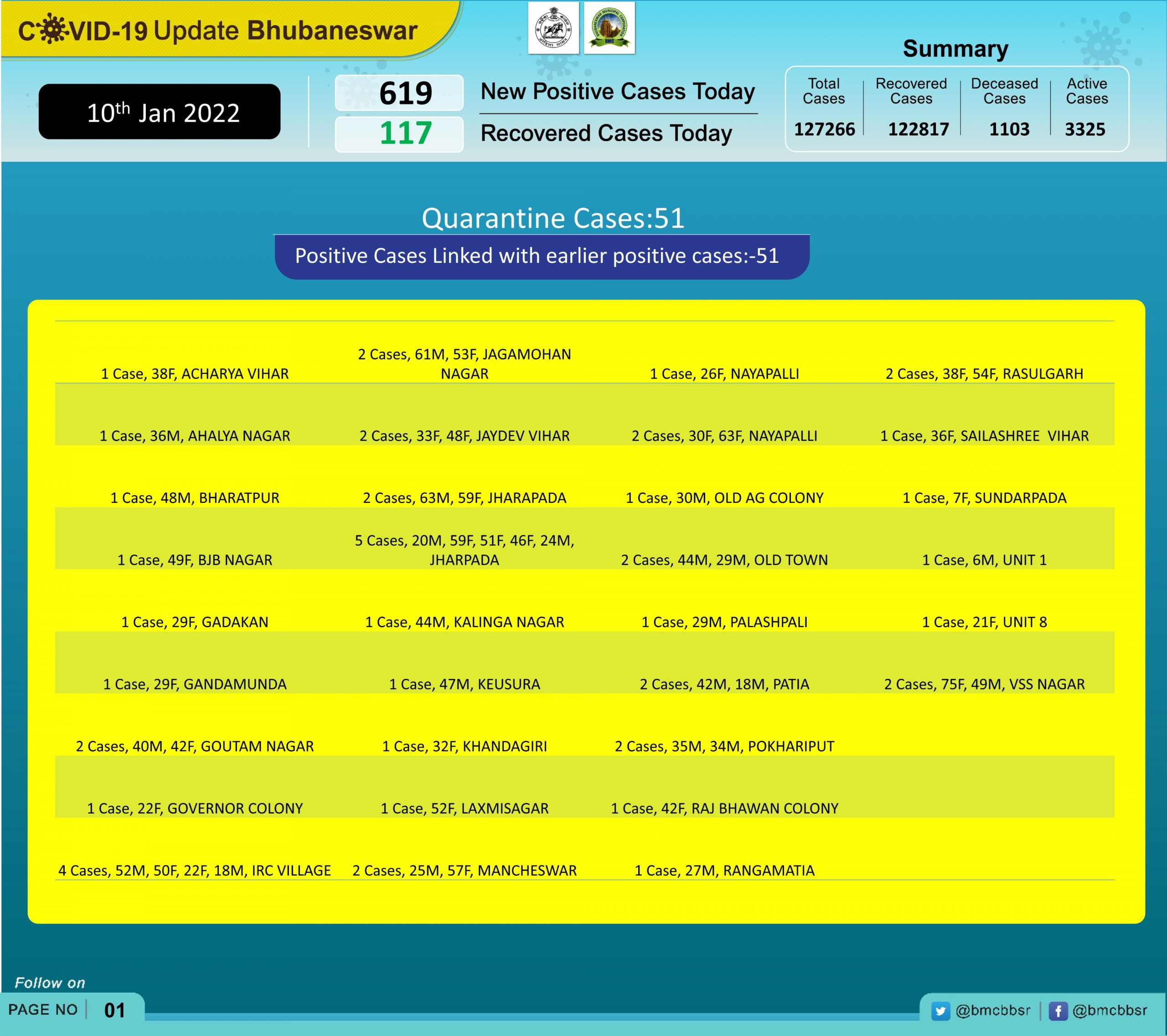 According to the Bhubaneswar Municipal Corporation, 51 of the new cases are from quartine and 586 local contacts.