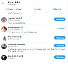 A screenshot of Karan’s Twitter handle shows that at present, he is following only his four Dharma production houses and the accounts of Amitabh Bachchan, Akshay Kumar, Shah Rukh Khan, besides Prime Minister Narendra Modi.