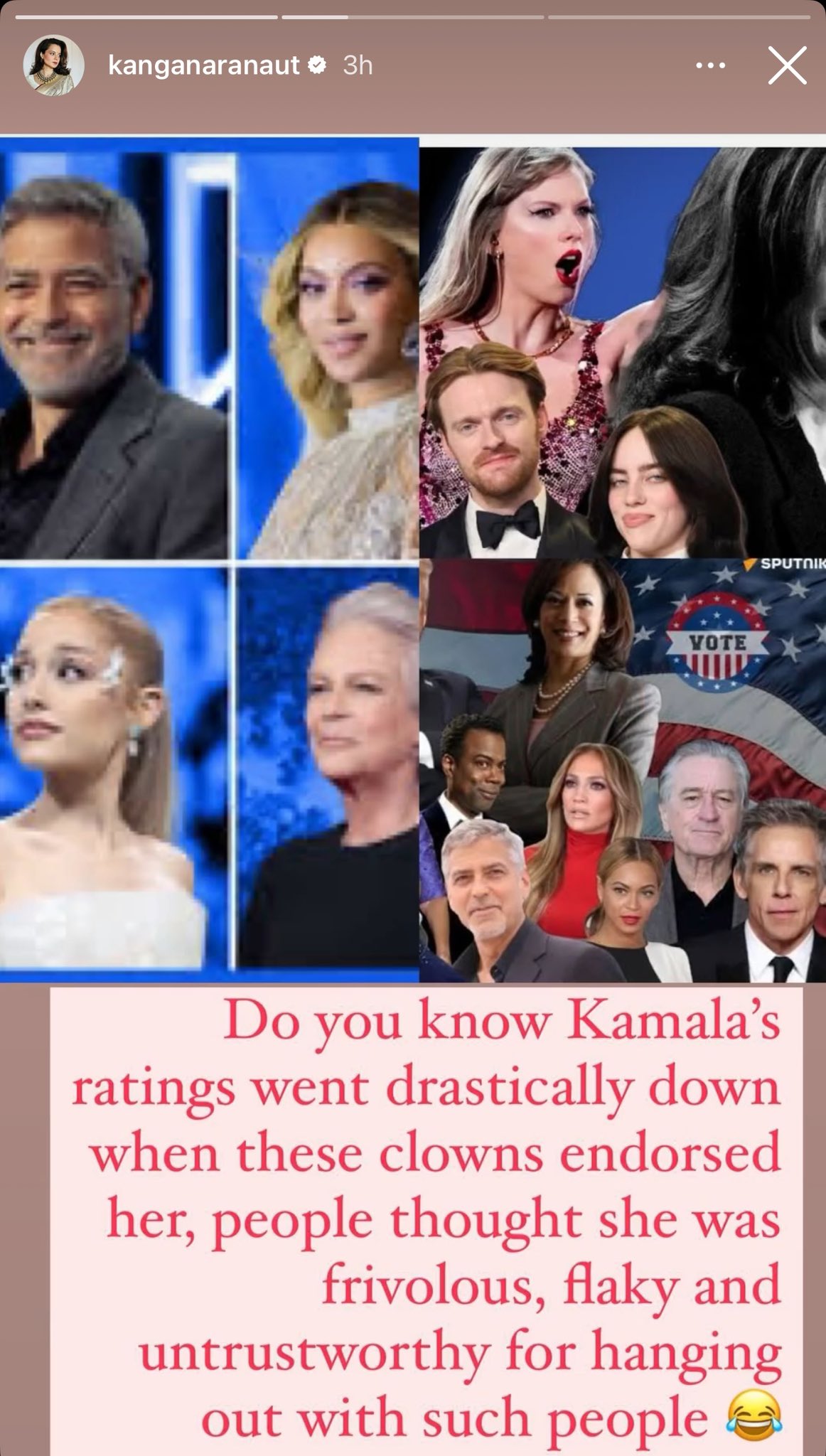 Calling Hollywood celebs ‘clowns’, Kangana wrote on her Instagram handle, “Do you know Kamala’s ratings went drastically down when these clowns endorsed her, people thought she was frivolous, flaky and untrustworthy for hanging out with such people (laughing face emoji).”
