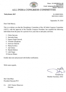 New Delhi: Ahead of the state assembly elections in Haryana, the Congress Party expelled 10 leaders in its state unit for six years for being involved in anti-party activities. This comes two days after 13 other leaders were expelled for the same period in its Haryana unit for the same reason.
