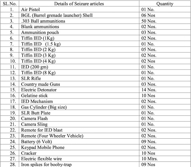 The dump was found in Jajbhata area (Tulsi Pahad) between Kirmiti and Katuapadar villages on Wednesday. Arms, ammunition, IEDs, IED-making materials, uniforms and other incriminating articles were recovered. It is suspected that these were intended to target civilians and security forces.